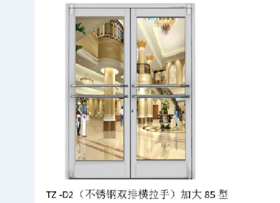 天卓牌肯德基門加大85型系列有根據外形的不同分為以下6種型號。TZ-A2(內扣板)標準55 TZ –B2(鋁合金圓管豎拉手)標準55 ;      TZ –C2(不銹鋼通長豎拉手)標準55型;TZ –D2(不銹鋼雙排橫拉手)標準55 ; TZ –E2(櫸木/紅木雙排橫拉手)標準55型;TZ –F2(不銹鋼彎月拉手)標準55型。天卓牌肯德基門加大85型系列標 規(guī) 格:門扇上橫看面100mm,下橫看面200mm,豎料看面85mm。