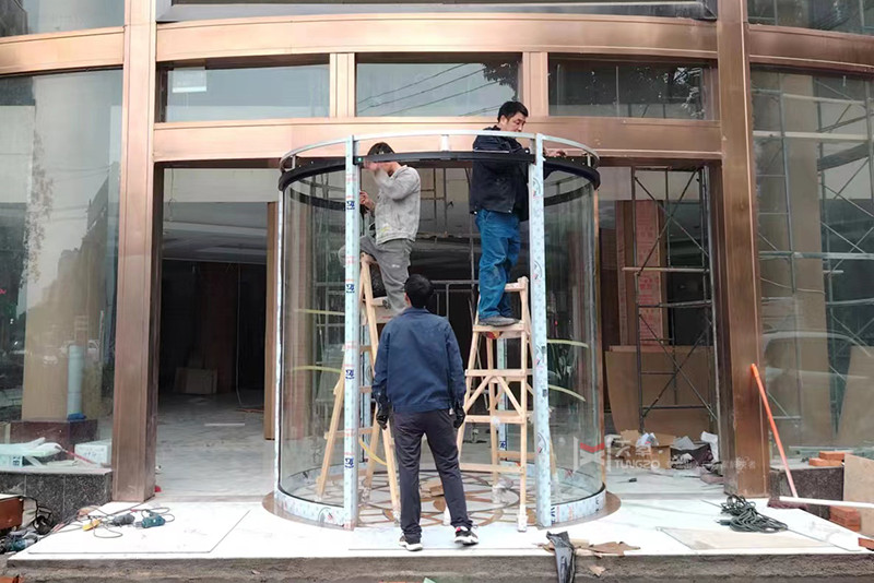 西安天卓自動門為漢中市古柏酒店定做的三翼自動旋轉(zhuǎn)門,采用鋁型材骨架,外包香檳金不銹鋼,旋轉(zhuǎn)門天花吊頂為:3mm鋁板噴涂,外弧玻璃為8mm熱彎鋼化玻璃,門扇玻璃為6mm鋼化玻璃,使用GMT地彈簧2臺,拉手L=12002付。