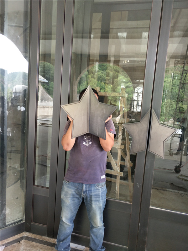 西安天卓自動門為延安紅星園酒店改造旋轉(zhuǎn)門,外飾面更換0.8m厚紫銅板,采用氟碳噴涂手工作色,旋轉(zhuǎn)門側(cè)地彈門采用鋁型材框架,5+20A+5雙鋼化中空10玻璃(外側(cè)透光率≥70%:中空玻璃充氮氣),8泰GMT140地彈簧,定制門五角星拉手。